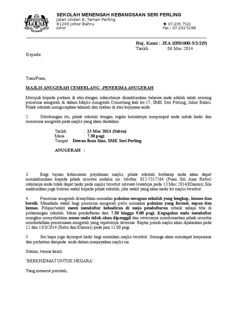 Contoh surat jemputan yb 1. ٢٩ جمادى الآخرة ١٤٣٦ هـ. Teks ucapan pengetua smk kulai besar puan hajah fouziah binti abu hamid sempena majlis anugerah cemerlang tahun 2011 te.